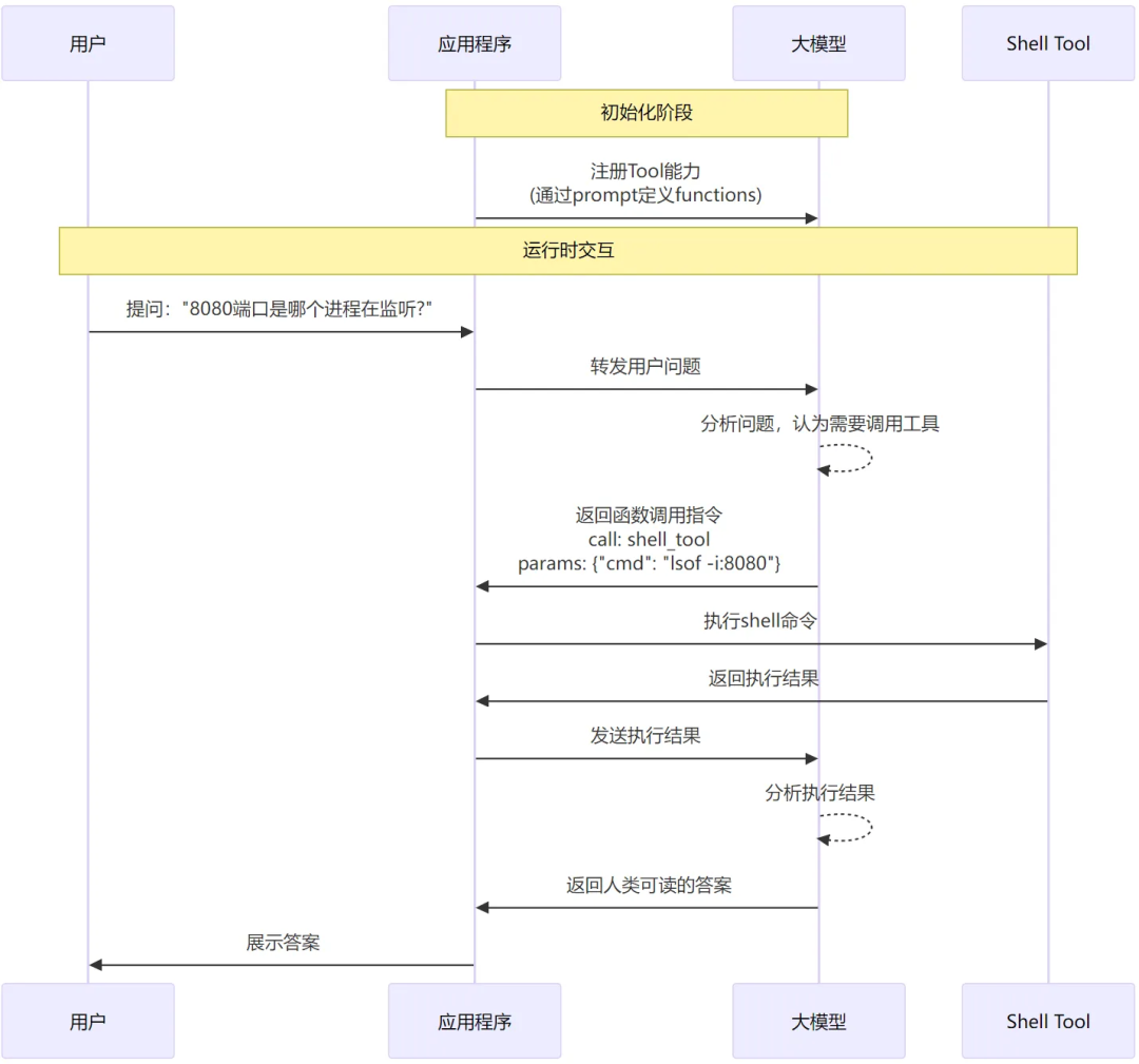从这里例子中我们可以看到一个基于大模型开发应用的基本思路:应用和大模型按需进行多轮交互,应用侧主要负责提供外部数据或执行具体操作,大模型负责推理和发号施令。