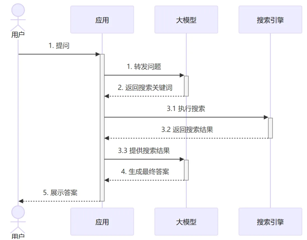 从图中可以看到,为了给用户的问题生成回答,实际上应用和 LLM 进行了两轮交互。第一轮是把原始问题给大模型,大模型分析问题然后告诉应用需要联网去搜索什么关键词(如果大模型觉得不需要搜索,也可以直接输出答案)。应用侧使用大模型给的搜索关键词 调用外部 API 执行搜索,并把结果发给大模型。最后大模型基于搜索的结果,再推理分析给出最终的回答。