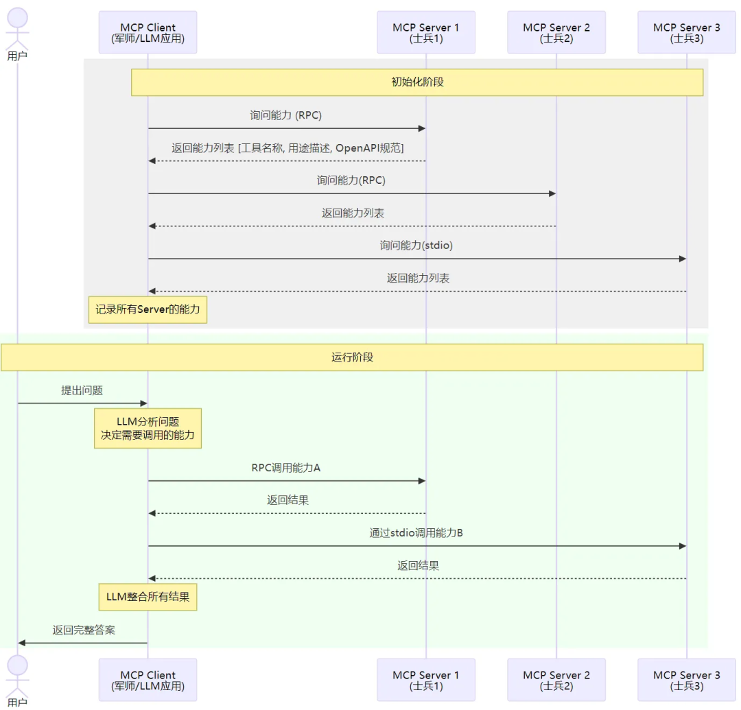 它其实是 一种流程 + 流程中使用的通信协议。如果要类比,有点类似于建立 TCP 连接,它包含了具体的握手流程,需要几次交互,每次发送什么内容,以什么格式描述。MCP 也是如此。这样讲依然抽象,看个例子就好懂了: