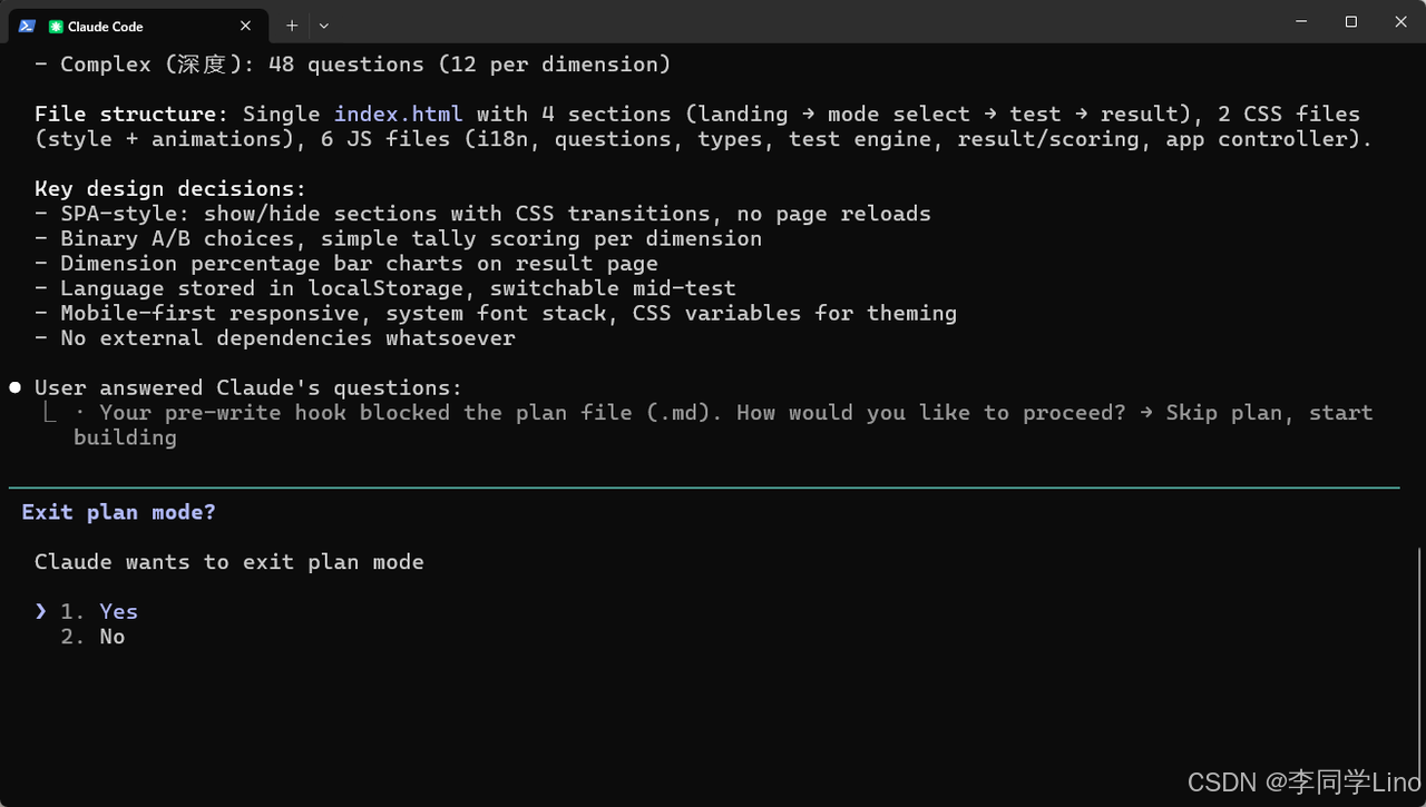 这句 Exit plan mode?,其实就是 AI 在正式向我请示: “老板,地基已经打好,蓝图已经全部刻在我的脑子里了。现在,我要脱掉产品经理和架构师的西装,换上底层码农的格子衫,正式下车间去给你搬砖写代码了。你批准吗?”