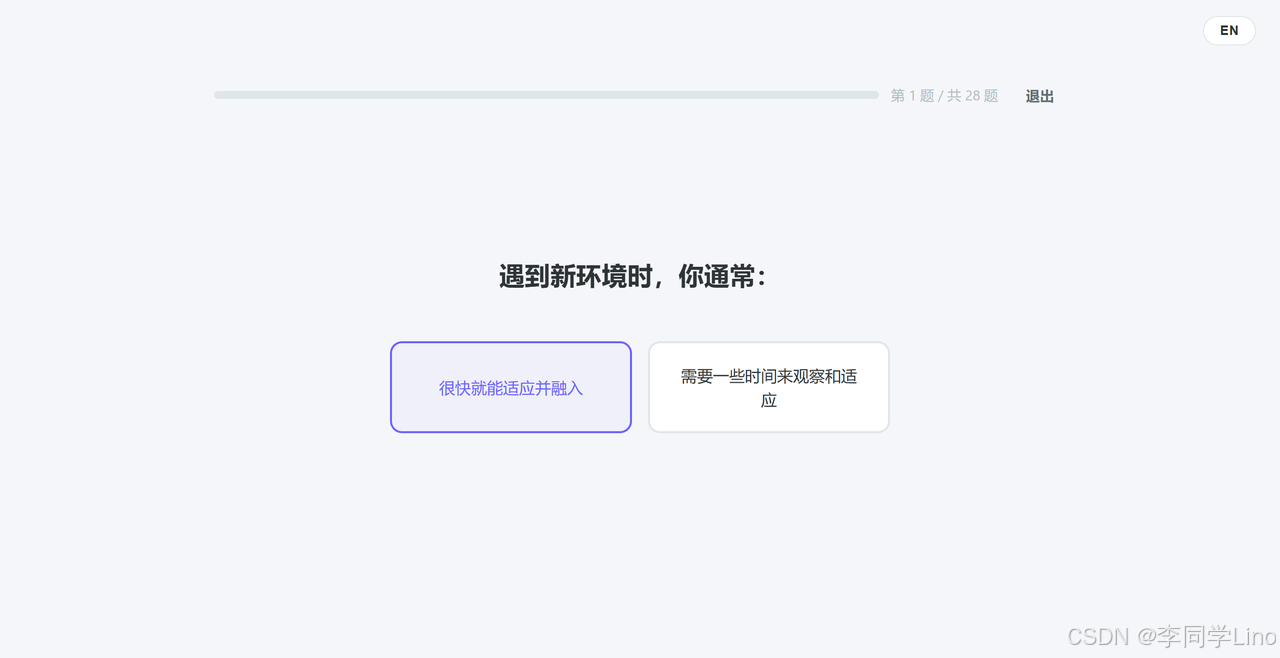 进入答题环节,体验更是直线拉升。 顶部的进度条随着答题实时平滑推进,选项按钮的 Hover 态和选中状态极具呼吸感。它不仅实现了纯前端的 SPA(单页应用)体验,全程零刷新,而且真的支持了我前面提到的键盘快捷键(按 1 或 2 直接答题)。