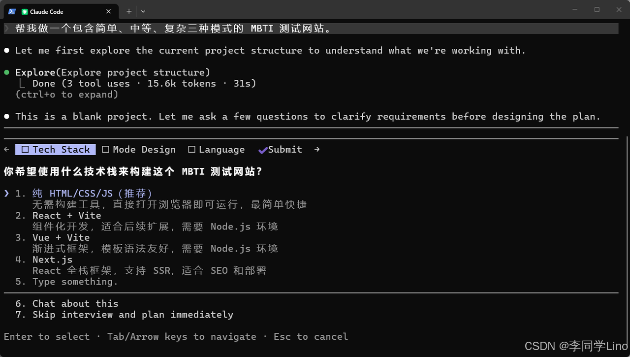它做的第一件事,不是回答,而是先去默默扫描了我当前的工程目录。发现这还是个空项目后,它直接在终端里给我拉起了一个带有顶部导航栏的可交互“需求调研表”!